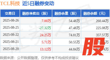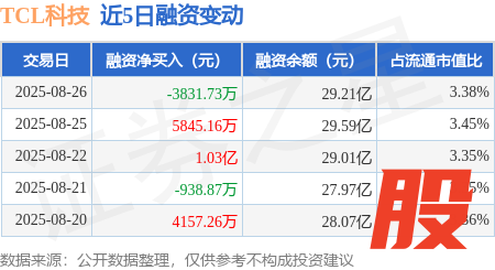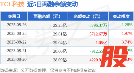 本站消息,8月26日,TCL科技(000100)融资买入2.47亿元,融资偿还2.85亿元,融资净卖出3831.73万元,融资余额29.21亿元,近20个交易日中有13个交易日出现融资净买入。